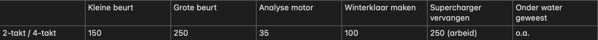 Prijzen zijn incl 21% BTW en exclusief de te vervangen onderdelen (Impeller, pakkingen, bougies etc.) Reparaties worden gerekend in werkplaats uren 79,- per uur